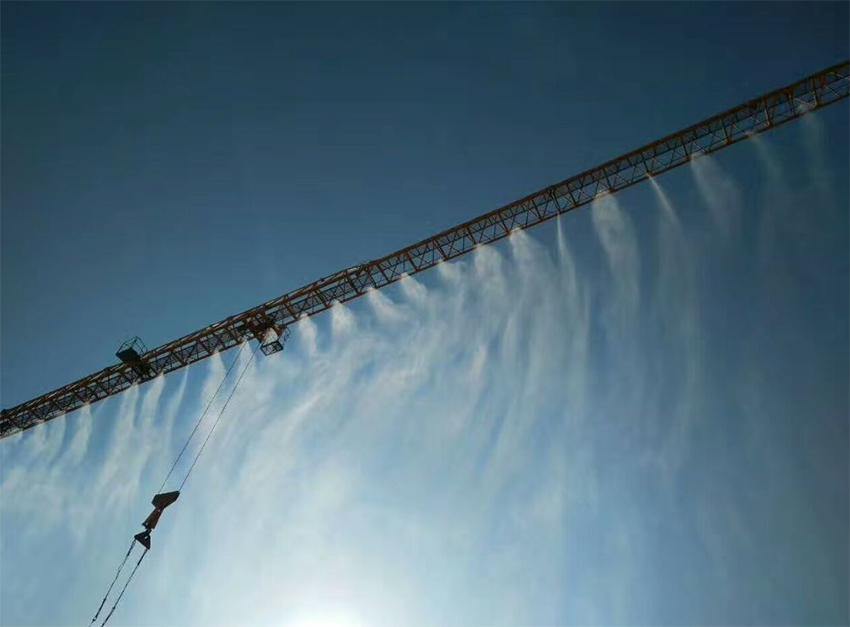 塔吊横臂始终在工地的至高点,喷水系统在塔吊的旋转范围内进行全方位、零死角雾状喷水,水通过喷嘴射出飘飞的水雾,可有效吸附空中的灰尘颗粒和杂质,可以控制工地扬尘不往外扩散,起到降尘的作用,同时在高空喷淋一段时间后,地面将形成一片湿润状态,能有效的压制住灰尘重新扬起。